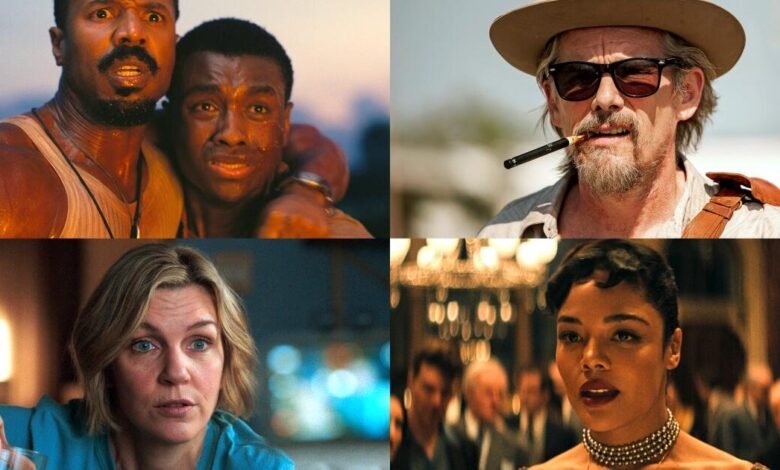 From left, Tessa Thompson in “Hedda”; Benedict Cumberbatch and Olivia Colman in “The Roses”; Michael B. Jordan and Miles Caton in “Sinners.”