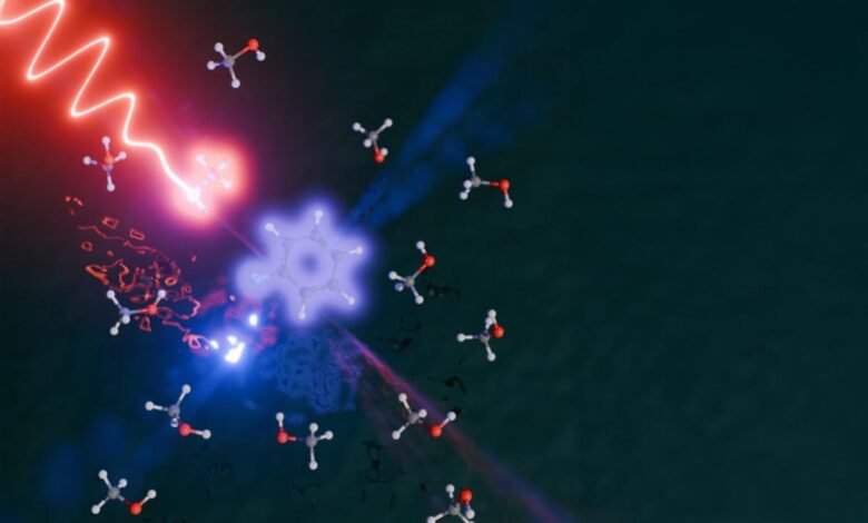 With this new setup in place, the researchers examined a series of simple liquid mixtures. They directed intense mid infrared laser light at methanol mixed with small amounts of halobenzenes. These molecules are nearly identical and differ only by a singleatom: fluorine, chlorine, bromine, or iodine.