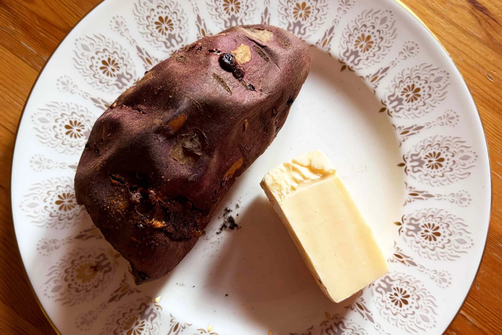 I prefer softer sweet potatoes, so I roasted mine at 425°F for just over an hour, then let them cool for 45 minutes. Then it was time to stuff. The tip of the Japanese sweet potato was easy to break open. I pushed a few pieces of Havarti through, filling it with as much cheese as the potato could hold before losing its shape. Finally, I took a bite.